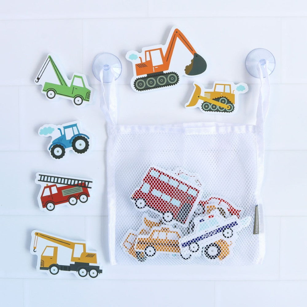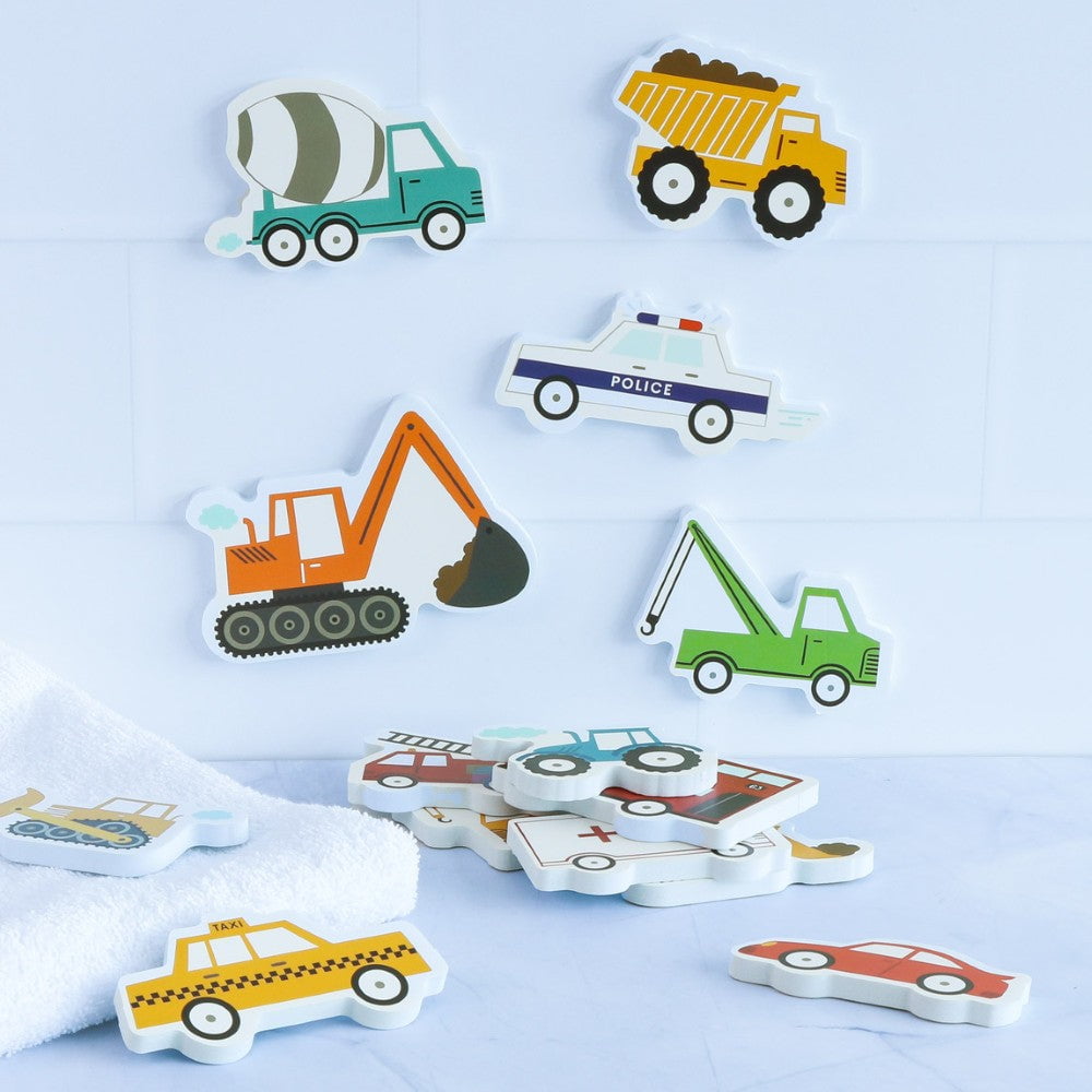 Featuring colourful cars, trucks, and planes, each foam piece sticks to the tiles or shower wall when wet for creative play.
