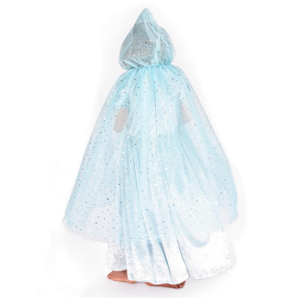 A long, sheer light blue chiffon cape with shimmering sparkle detail.