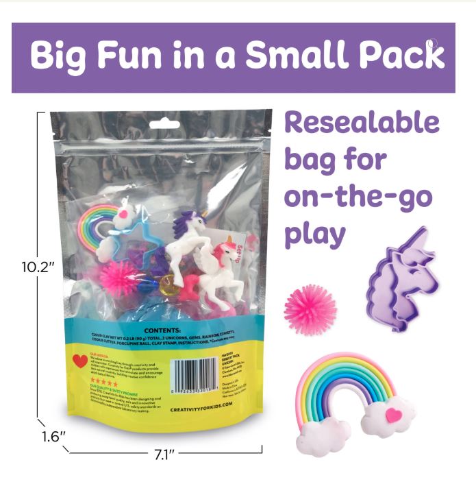 Contents Include: 2 Colors of cloud clay Pink and Blue, 2 Unicorns, 3 Sparkly gems, 1 Rainbow, 1 Star cookie cutter, 1 Bag of rainbow confetti, 1 Porcupine ball, 1 Unicorn clay stamp and Instructions