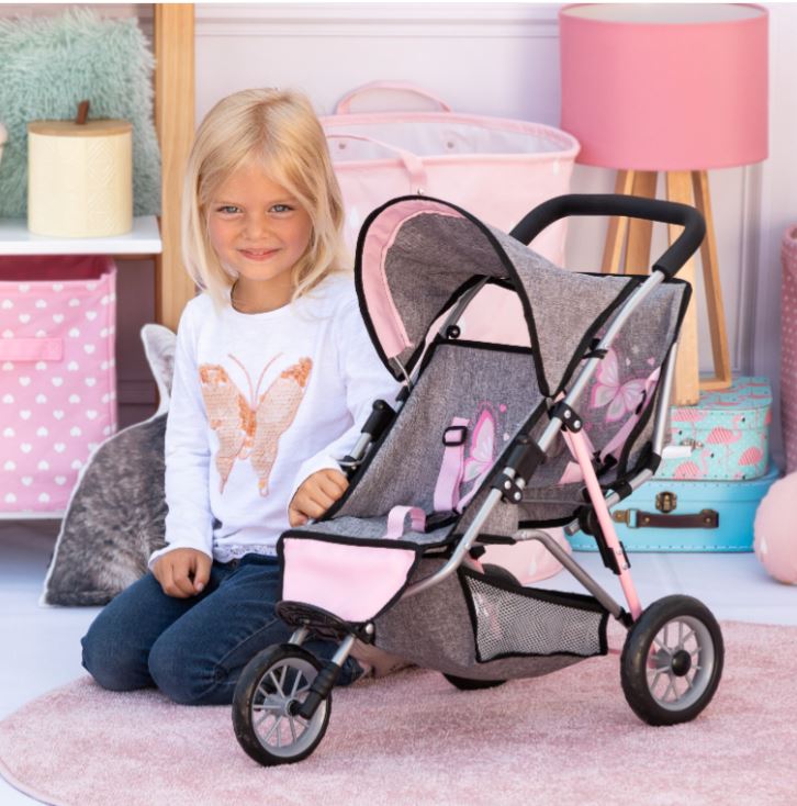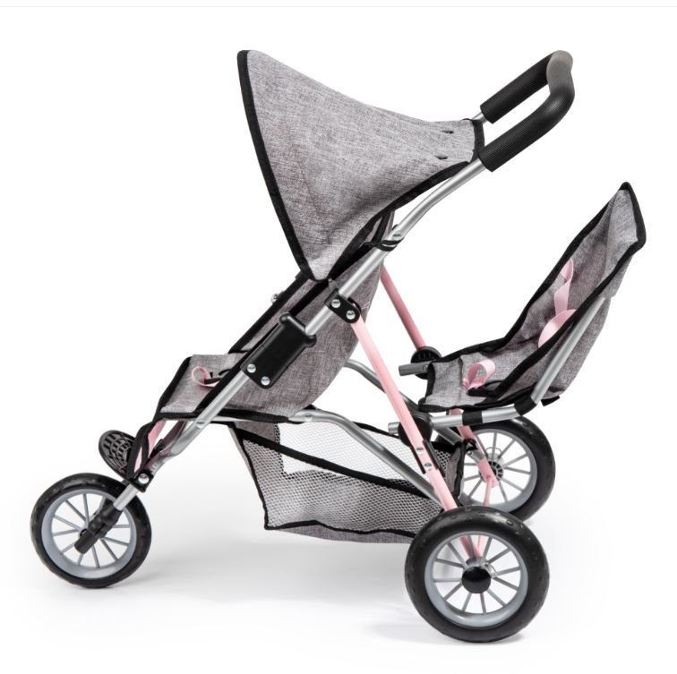 This fashionable twin dolls prams or sibling stroller has a modern design.