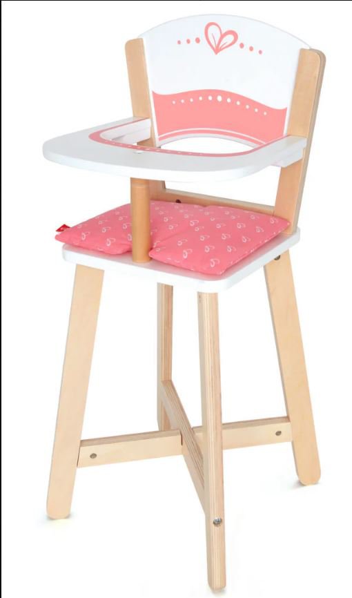 This mini highchair encourages dolls to sit up straight and be looked after and fed.  Ask what dolly's favorite food is - watch your child guiding their doll to eat. (2 piece) highchair and cushion.