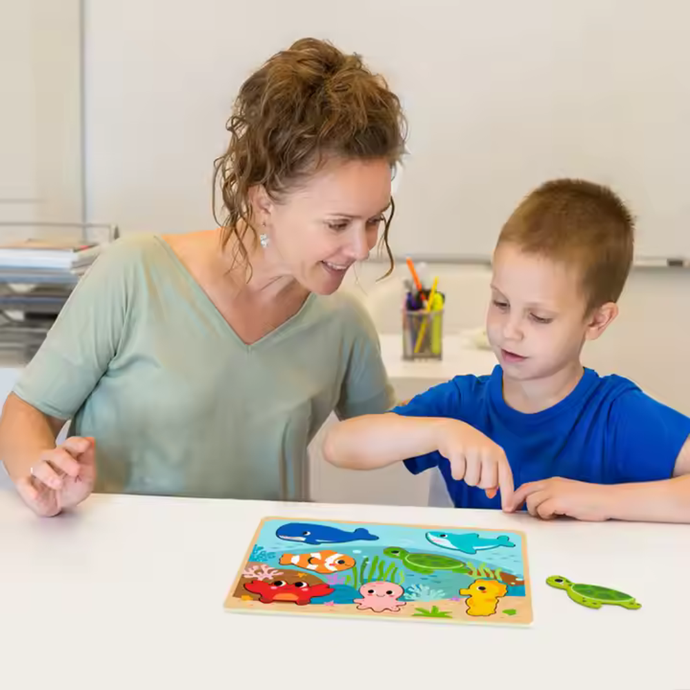 This vibrant, marine-themed chunky puzzle is designed for young children to explore the wonders of the ocean.