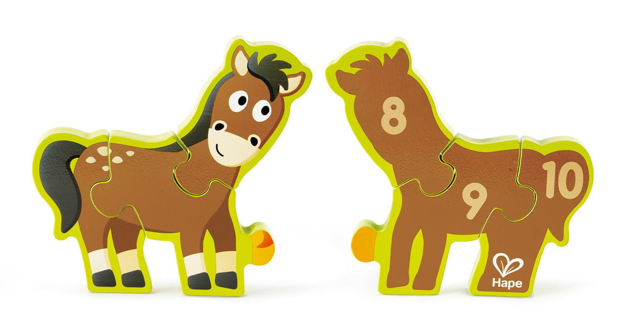 Beautifully crafted 10-piece, wooden puzzle with farm animals on one side and the numbers 1 to 10 on the other. Puzzle stands upright on the table.