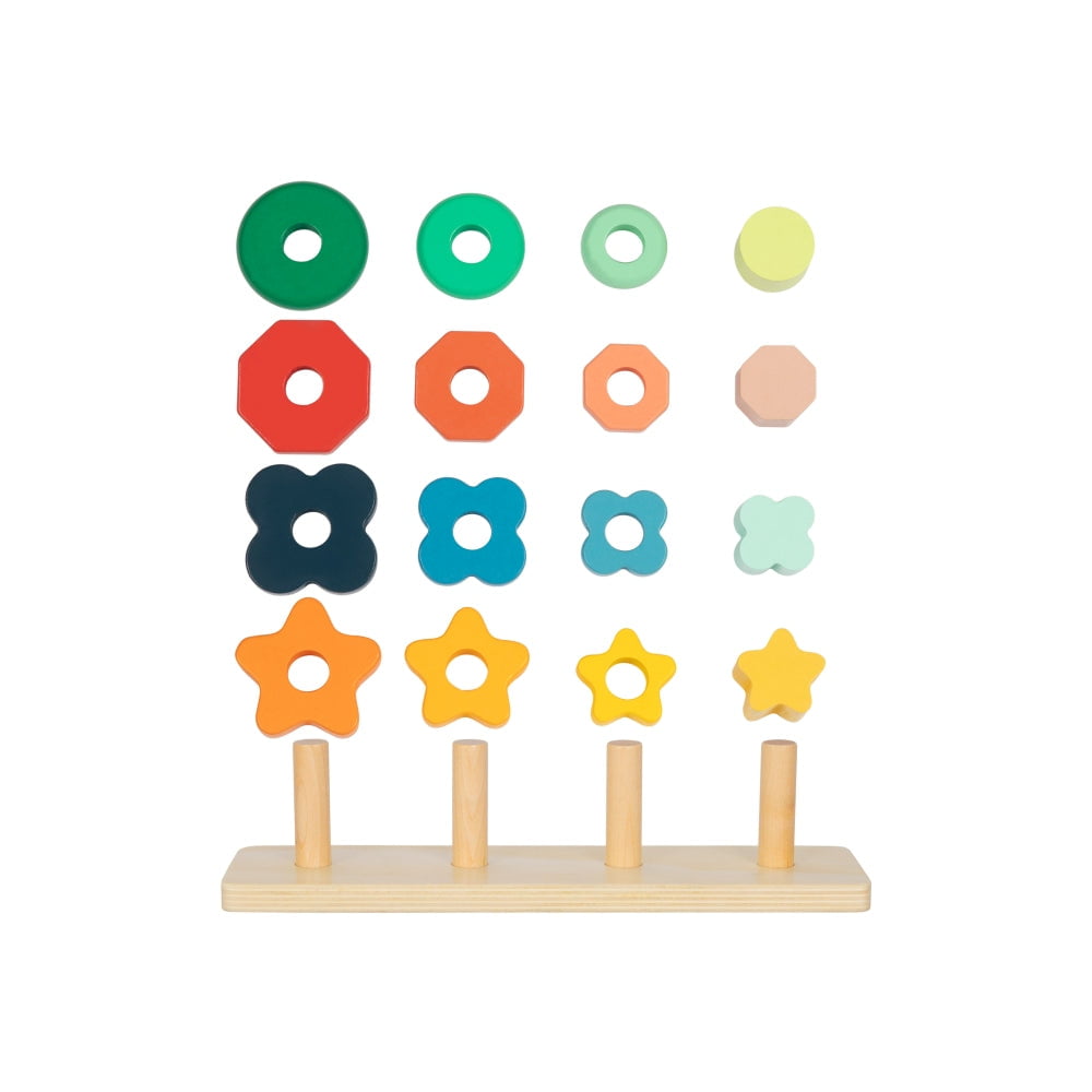With a sturdy wooden base and four pegs , children can match and stack the colourful shapes to their corresponding colours, supporting number recognition and colour awareness.