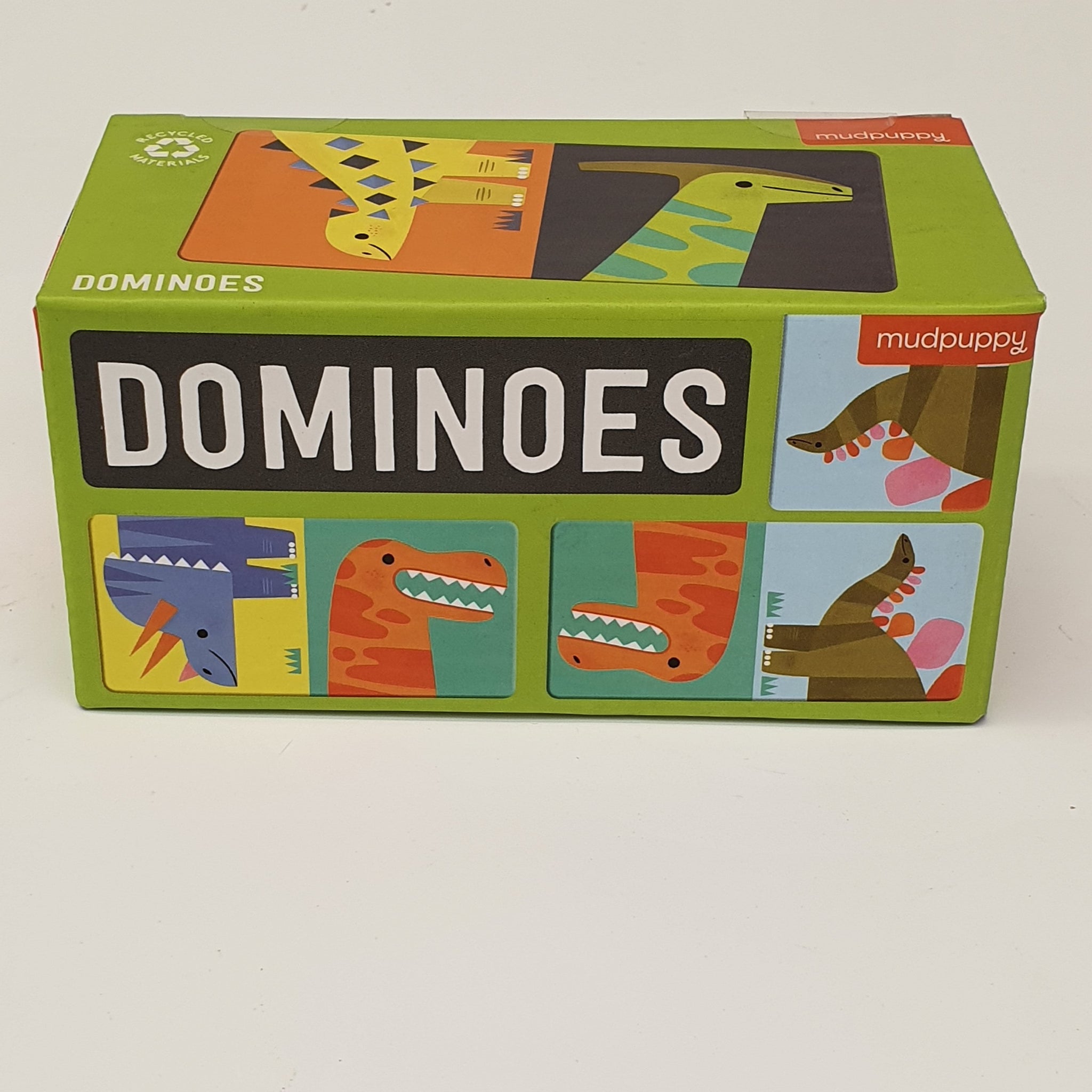 Dinosaur  Dominoes from Mudpuppy includes 28 oversized double-sided dominoes featuring colorfully illustrated images on one side and numbered stars on the opposite side—two ways to play!