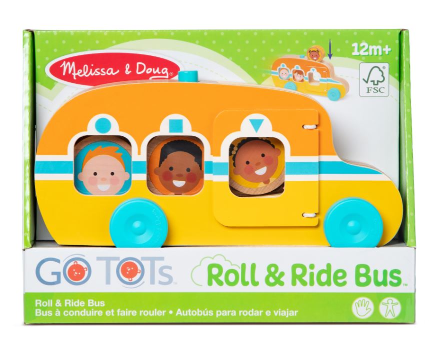 Three double-sided chunky wooden GO Tots disks (six characters) spin and bounce as the bus rolls! Press the button on top of the sturdy wooden bus and GO Tots roll out the back!