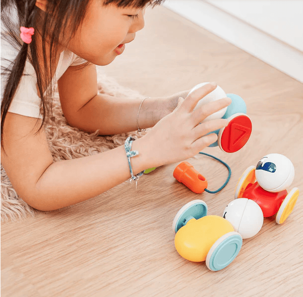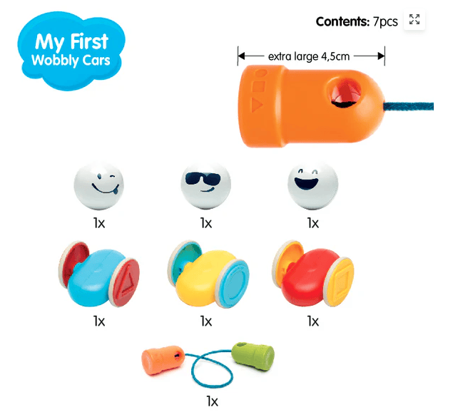 Go on an exciting, wobbly adventure with these magnetic fun-moving cars! Create your own Wobbly train and pull it along. Mix your cars and metal balls to create different wobbly combinations or use the pull rope as a fishing rod.